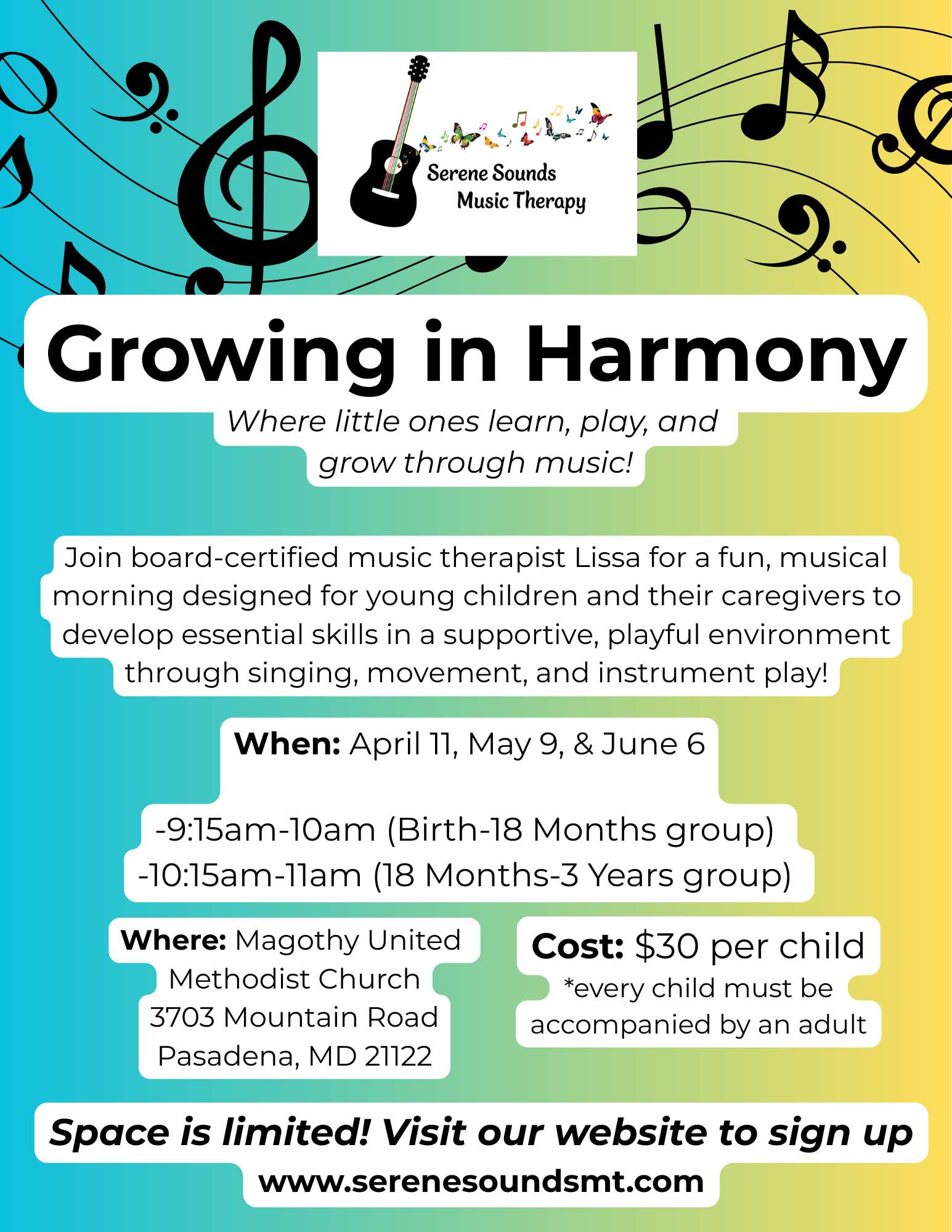 Growing in Harmony is 45 minutes long and uses music making as a way to practice all of the children's emerging and developing skills in the areas of language and communication, movement, and social and emotional interactions!